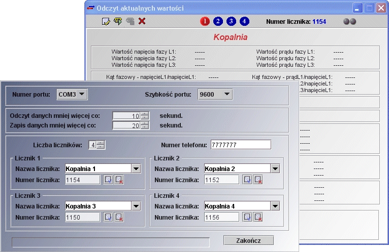 Okno konfiguracyjne dla odczytu wybranych rejestrów licznika.