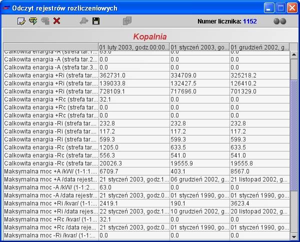 Przykładowy odczyt logu zdarzeń z licznika.